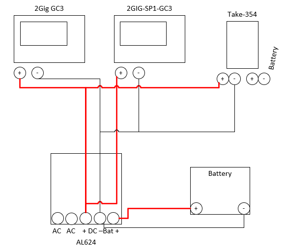 A 12VDC 5AH-7AH battery used only for the security panel sensors is the standard setup.