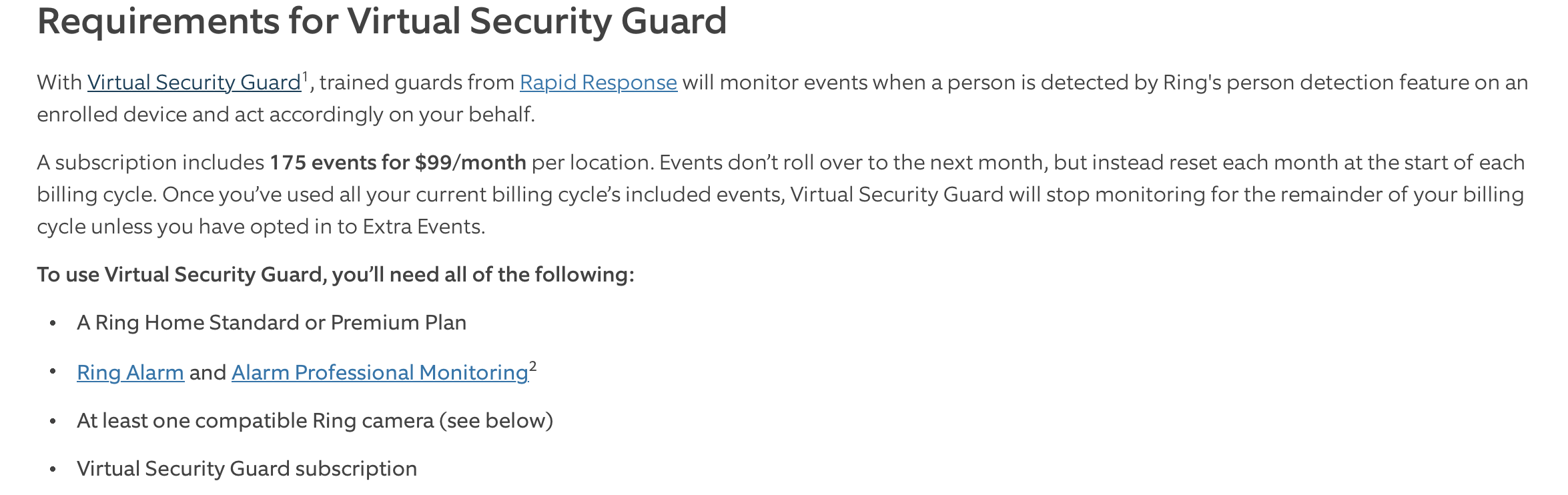 Ring’s pricing isn’t per-event. It’s a flat fee per site with a limit on the number of events. If you have 1 event in a month it’s still $99. The $99 is on top of their alarm monitoring so it’s $120 to $130 per month total.