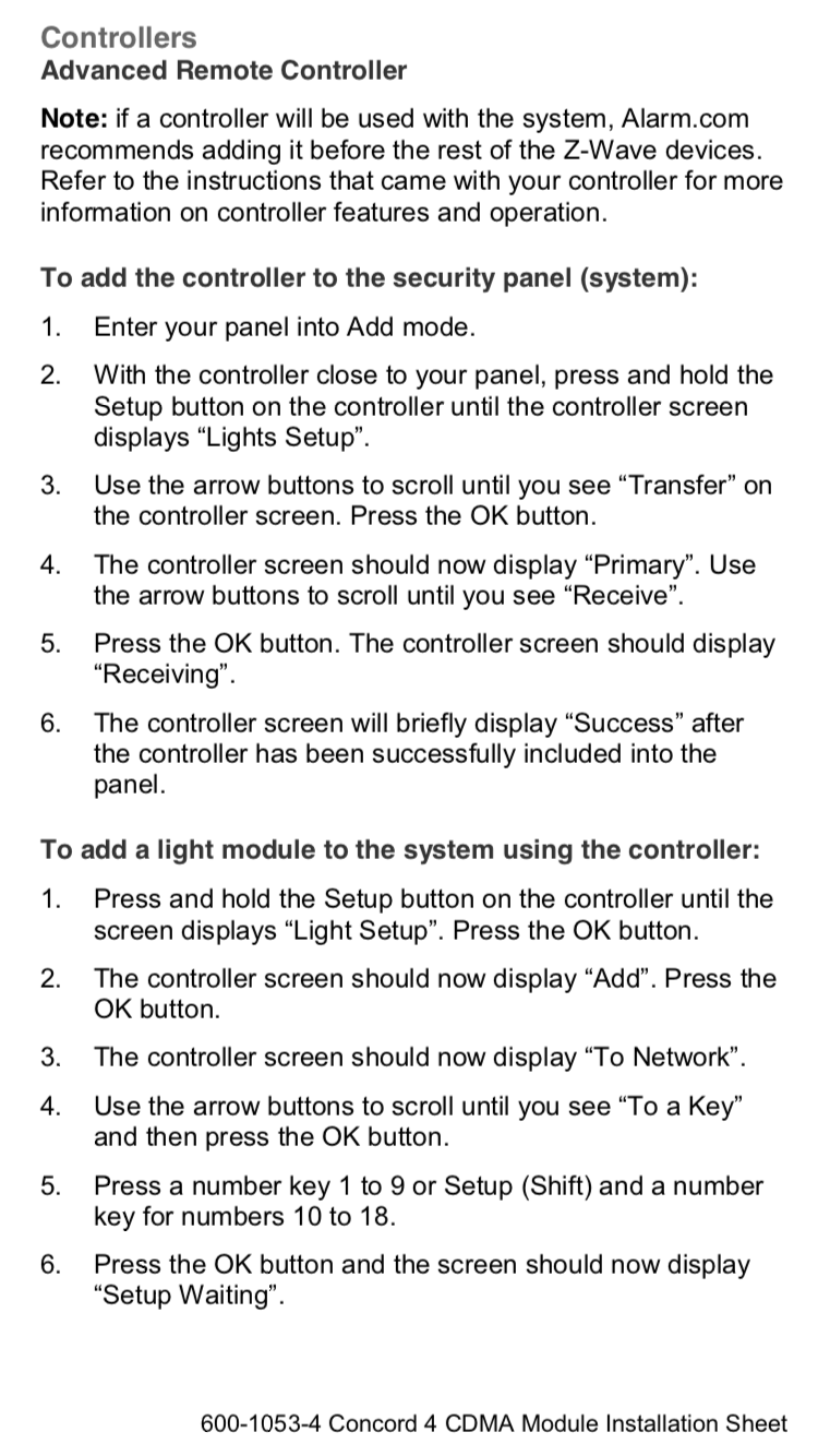 Can you offer a how to on adding the GE 45601 controller into the system so that I am able to use it for adding the rest of my modules? I know that it won’t add my locks or garage door controller but, I used to be able to add new lights and such with the remote. I can’t remember how I originally set that up. But the way I had it set up I was able to add or remove devices with either the remote and/or the concord 4 zwave module. I’ve attached the instructions I used to add the remote into the system currently which doesn’t allow me to do what I’d like.