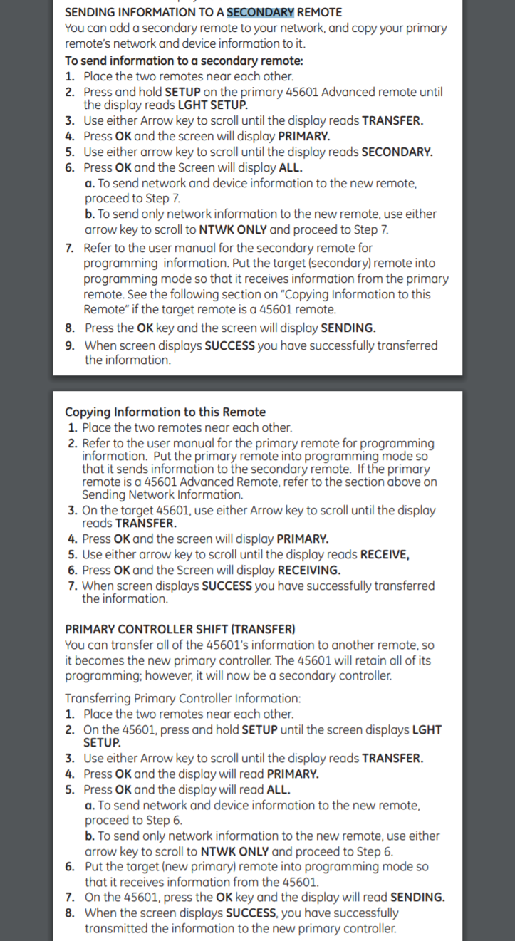 I am attaching instructions from the manual for the GE remote you are using which may be relevant, however. They discuss transferring node data from the remote and passing Primary control to another controller.