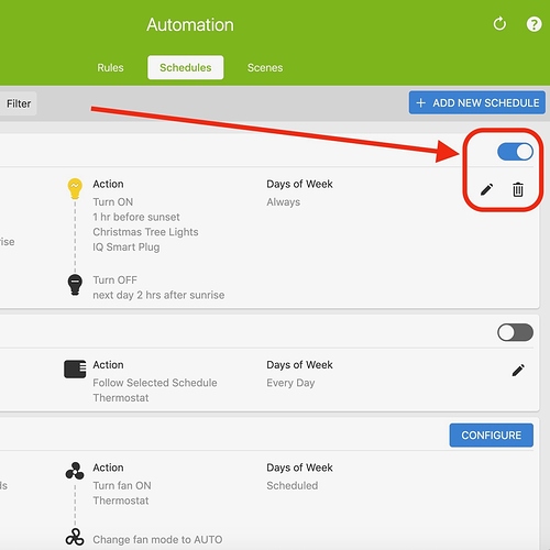 6. You will see your new rule listed under schedules and can toggle the rule on and off, edit the schedule, or delete the rule as needed here.