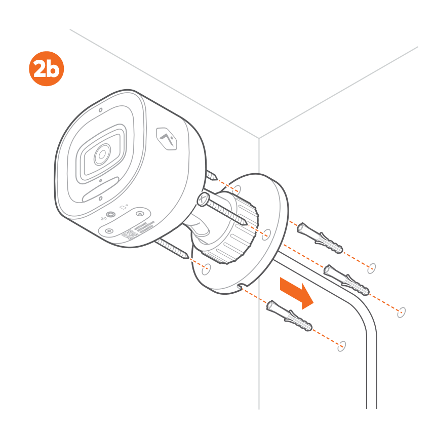 - Line up the camera with the three holes created in step 3. Use the included ST4.8 x 32mm self tapping screws to fasten the camera to the mounting surface (#10 drywall screws or 3/16" Tapcon screws are also acceptable).