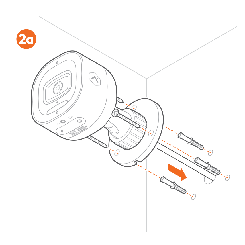 - Line up the camera with the three holes created in step 3. Use the included ST4.8 x 32mm self tapping screws to fasten the camera to the mounting surface (#10 drywall screws or 3/16" Tapcon screws are also acceptable). Route the cable through the cut-out in the mounting plate.