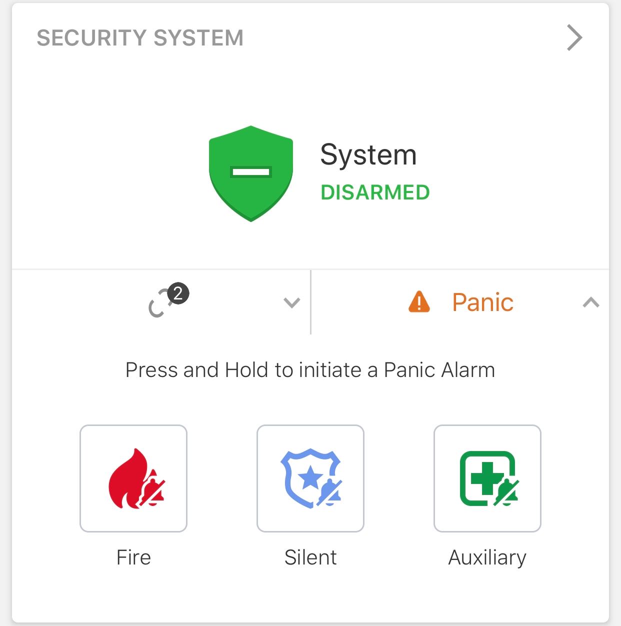 If enabled on the account, In-App Panel Panic is always available in the Security System card on the home page of the Alarm.com app.