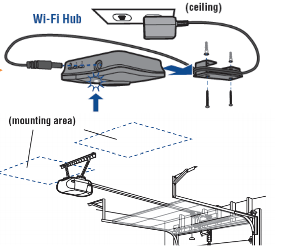 Install the bracket for Wi-Fi Hub on the ceiling near the garage door opener.