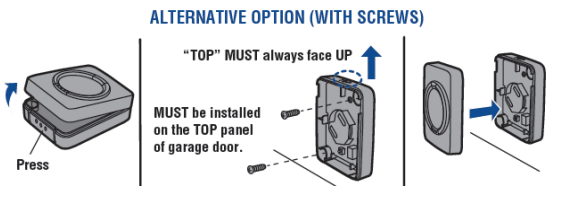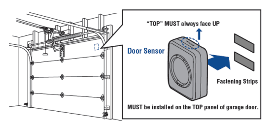 Position the door sensor vertically and attach to a clean, dry location on the top panel of the garage door with fastening strips (provided).