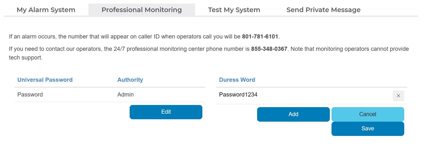 Universal Password (required) - This password can be used by all contacts and is the all clear password for alarm events. Given to identify when speaking with monitoring operators.
