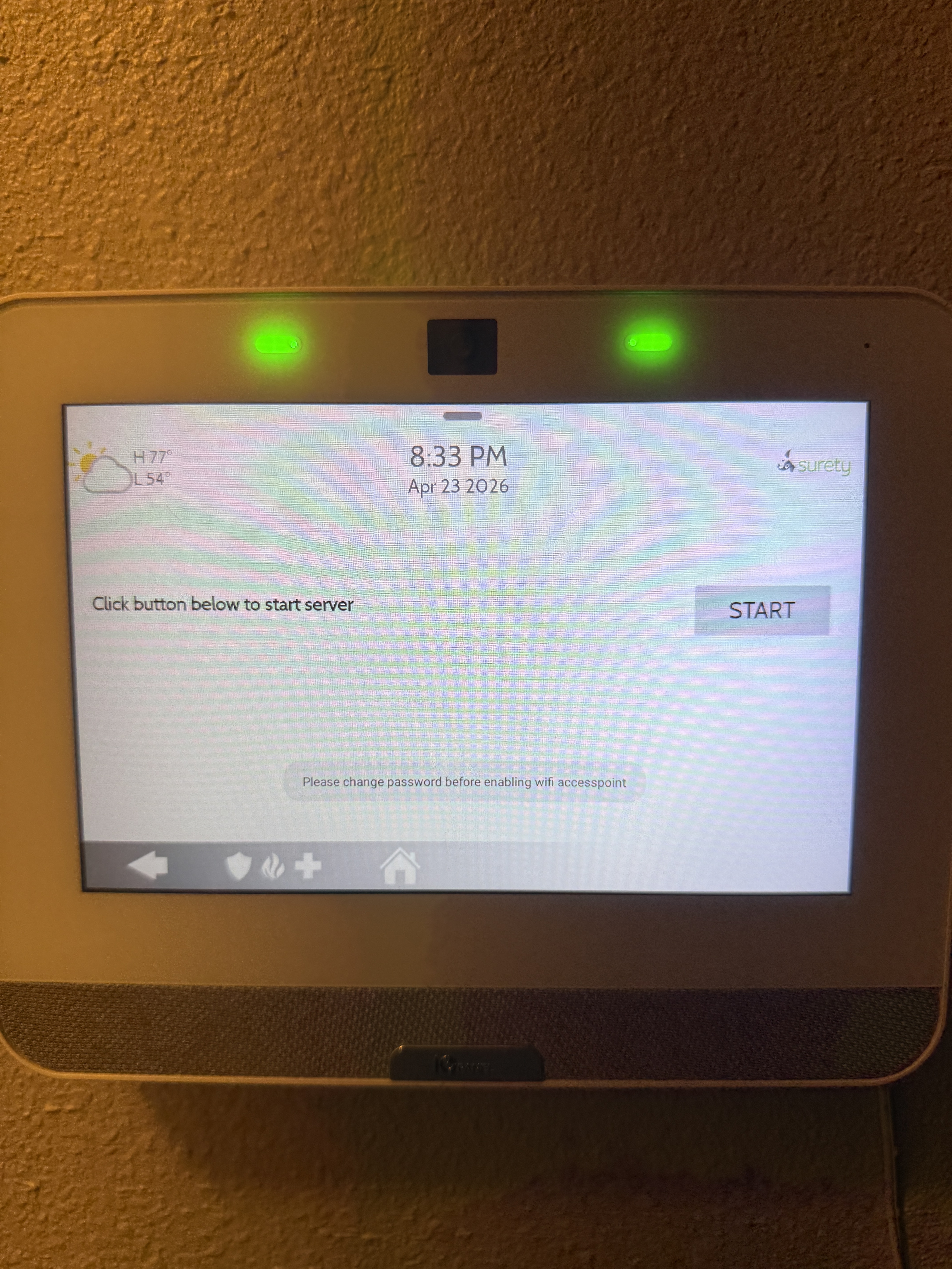 Swipe down > Settings > Advanced Settings > Enter Installer or Dealer Code > Installation > Devices > Wi-Fi devices > Access Point Settings > Enable Wi-Fi Access > Change Password > Create password and confirm then save > You can disable the Wi-Fi access point if you’d like and now you should be able to enable the server