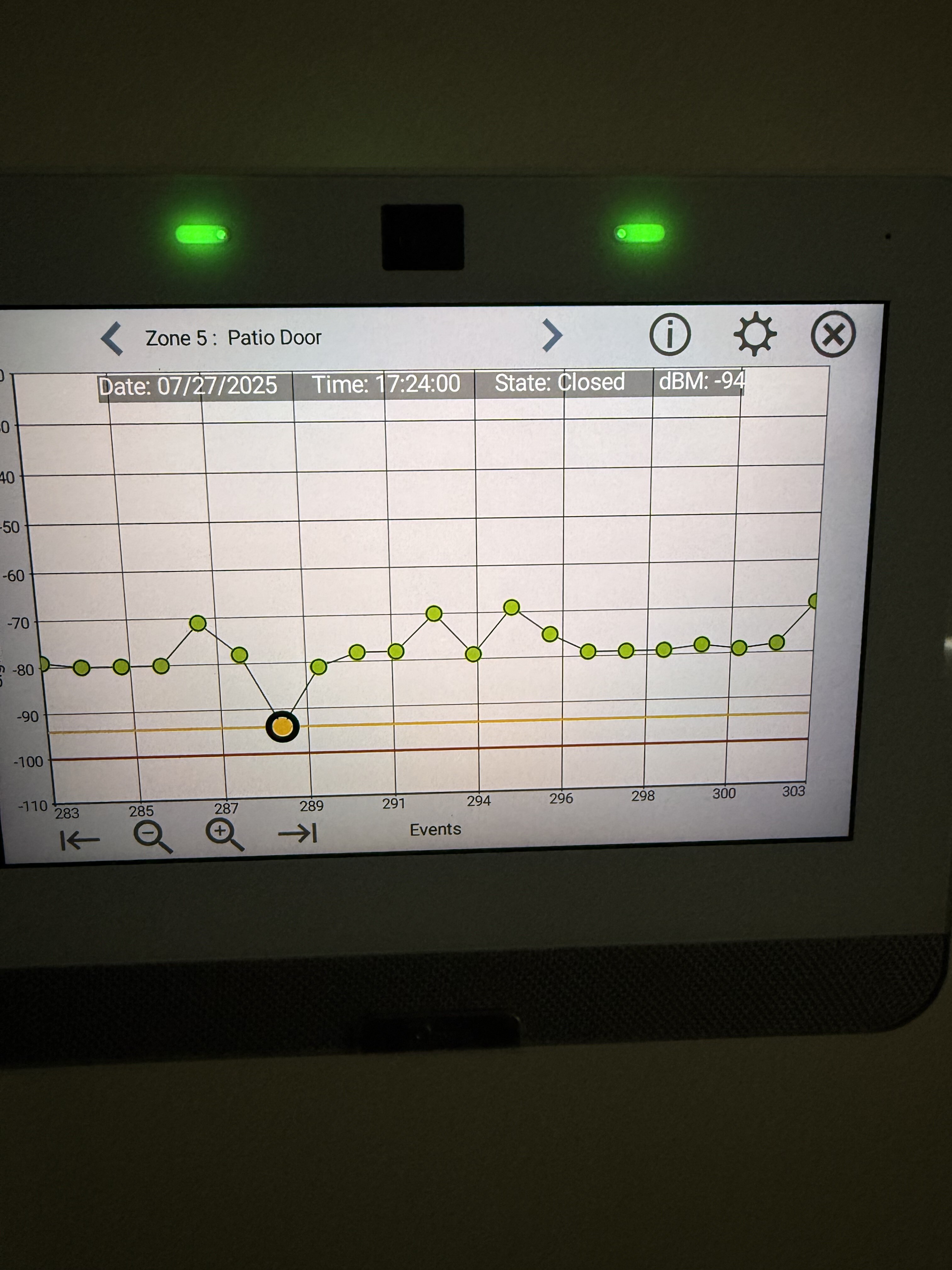Next, arrow back one time and press sensor test > Check the patio door history by pressing the graph icon next to the patio door. You can go father back by pressing the magnifying glass with the - Icon. Does it drop below red at any moment?