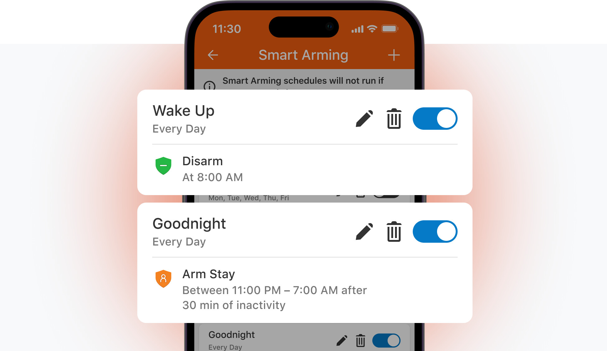 You can create Smart Arming schedules for each day of the week, so security matches changing routines like early weekdays and relaxed weekends.