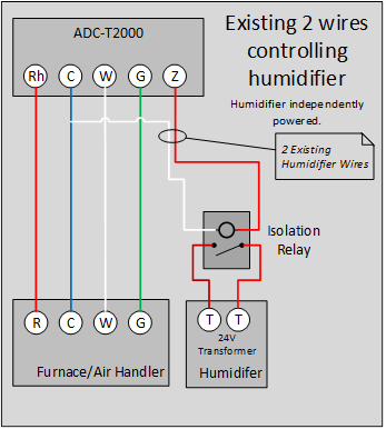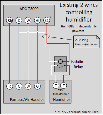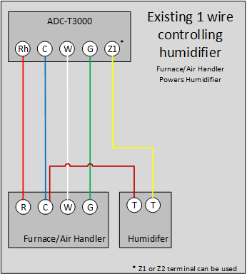 This is a common configuration. Typically, these systems are already wired into the existing thermostat, likely connected to an H, DH, or X terminal. In these cases, wire this directly to the Z terminal on the Smart Thermostat (ADC-T2000) or the Z1 or Z2 terminals on the Smart Thermostats (ADC-T40K-HD or ADC-T3000).