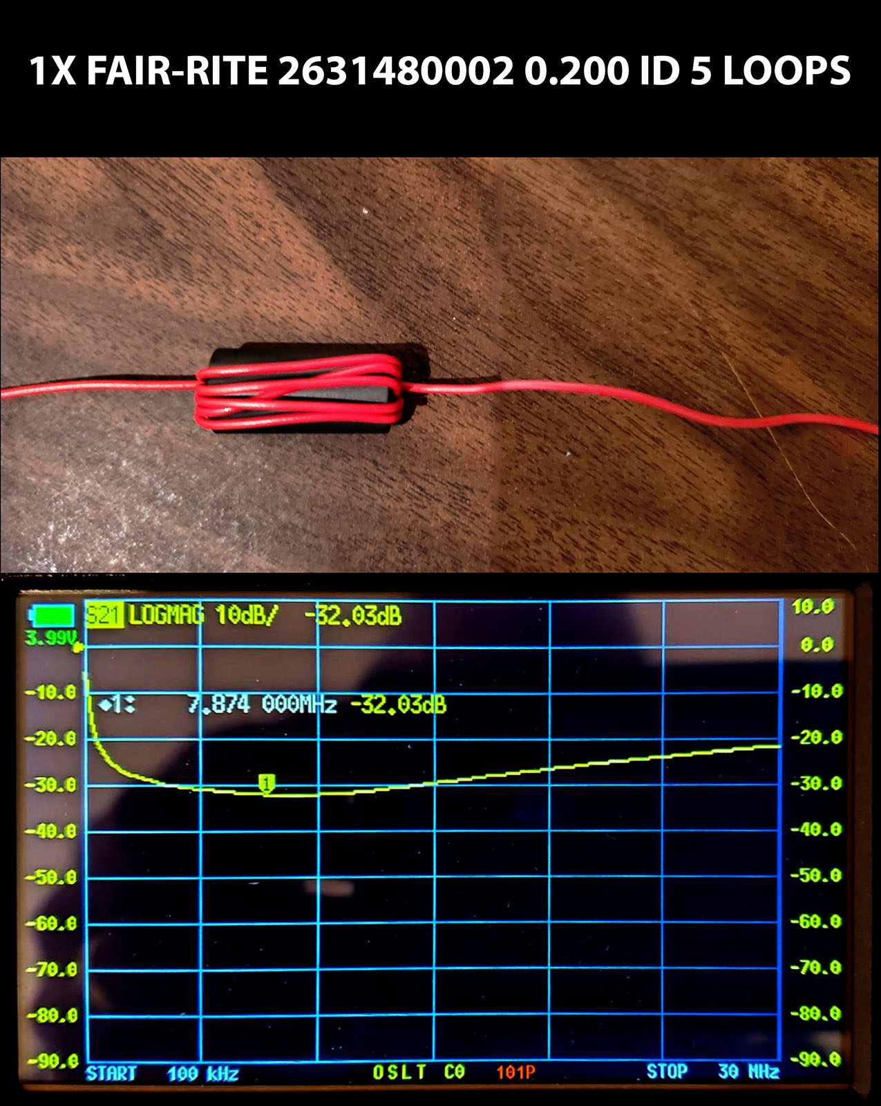 I’ve installed Mix 31 ferrite beads inside the hardwire translator box on all 16 zone wires including the smoke/fire circuit wires, and the incoming power wires (on both red and black). This mix is specifically designed to suppress RFI at the relevant frequencies/bands (7MHz/40m, 14MHz/20m, 21MHz/15m and 28MHz/10m). I’ve verified they’re suppressing these frequencies 21-32 dB. With the ferrites installed, the problem appears to be solved for 20m, 15m and 10m, but I’m still getting tamper alerts while transmitting at 7MHz/40m. This is despite the best ferrite suppression (32 dB) being at 7MHz/40m.