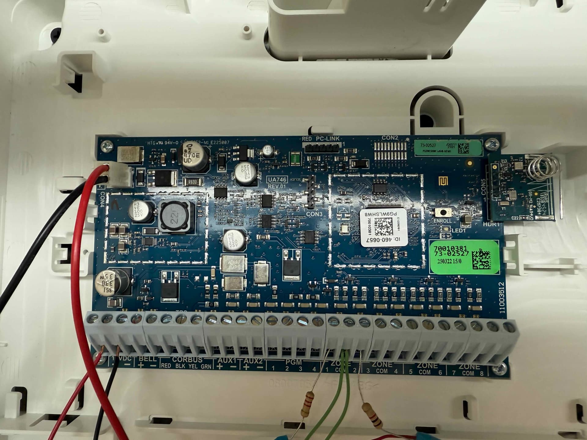 It looks like you’re missing a resistor across the BELL+ and BELL- terminals. If you do not have a siren wired to the module, you need to put a 1 kΩ across the bell terminals, or it will cause a bell trouble.