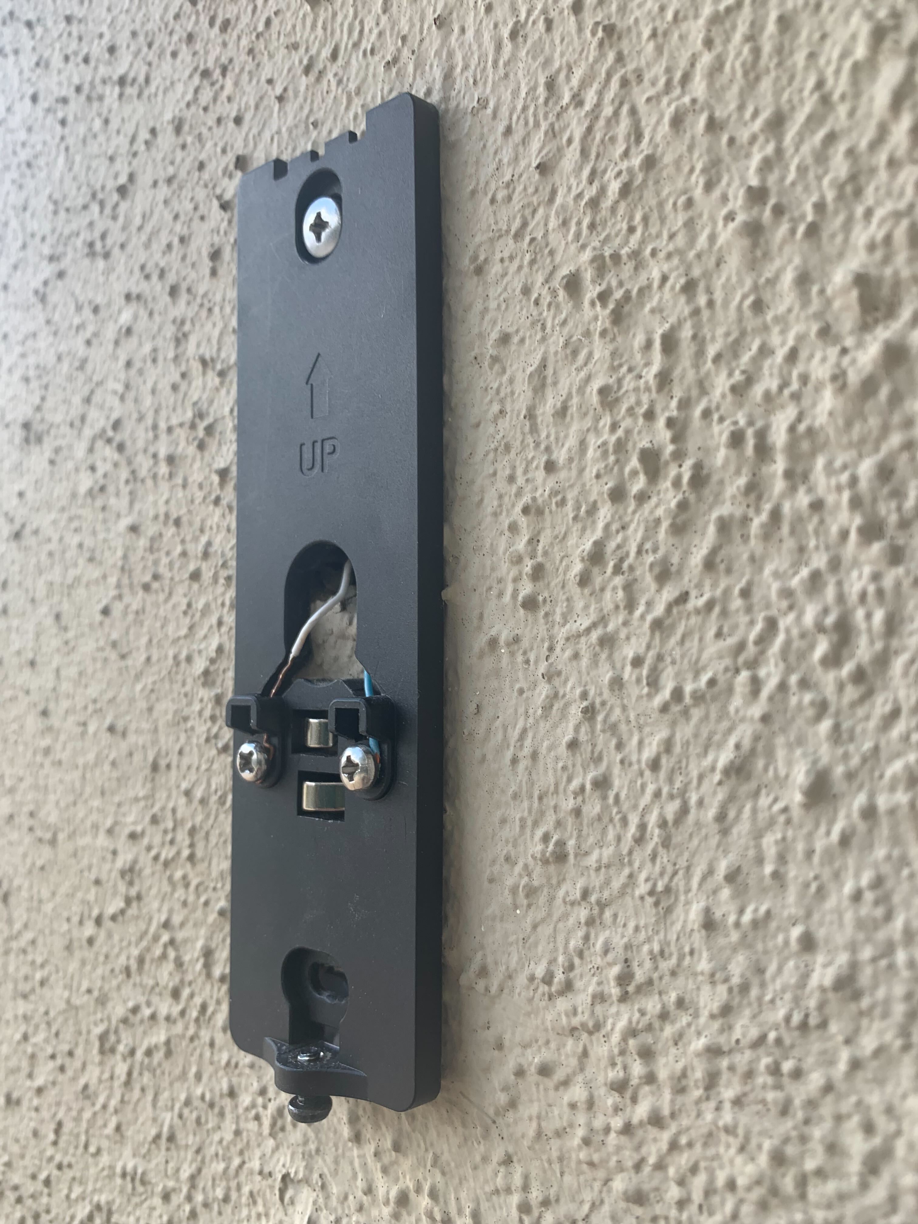 It is difficult to tell, but it looks like the bottom of the doorbell is off the surface of the wall a bit more than the top and the back plate may be bowed or twisted a bit. Is there a bit lumpier texture under the bottom of that doorbell in that spot?