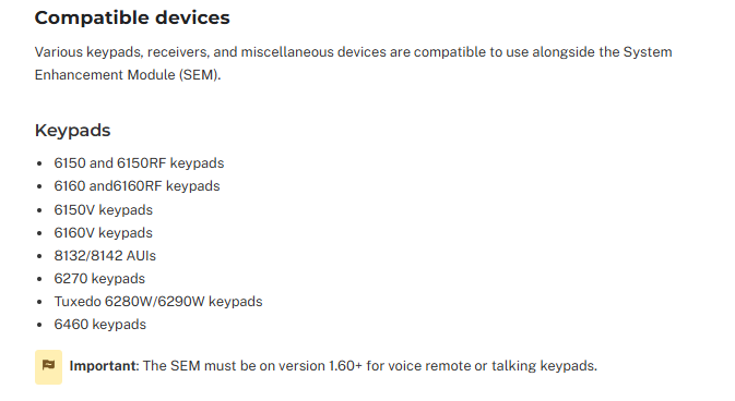 Alarm.com has a compatible devices that work alongside the SEM (alarm.com communicator). The 6164US is not on the list of compatible devices. It may be that it will have issues reading the zones behind the keypad or that the SEM and this specific keypad have not been tested.