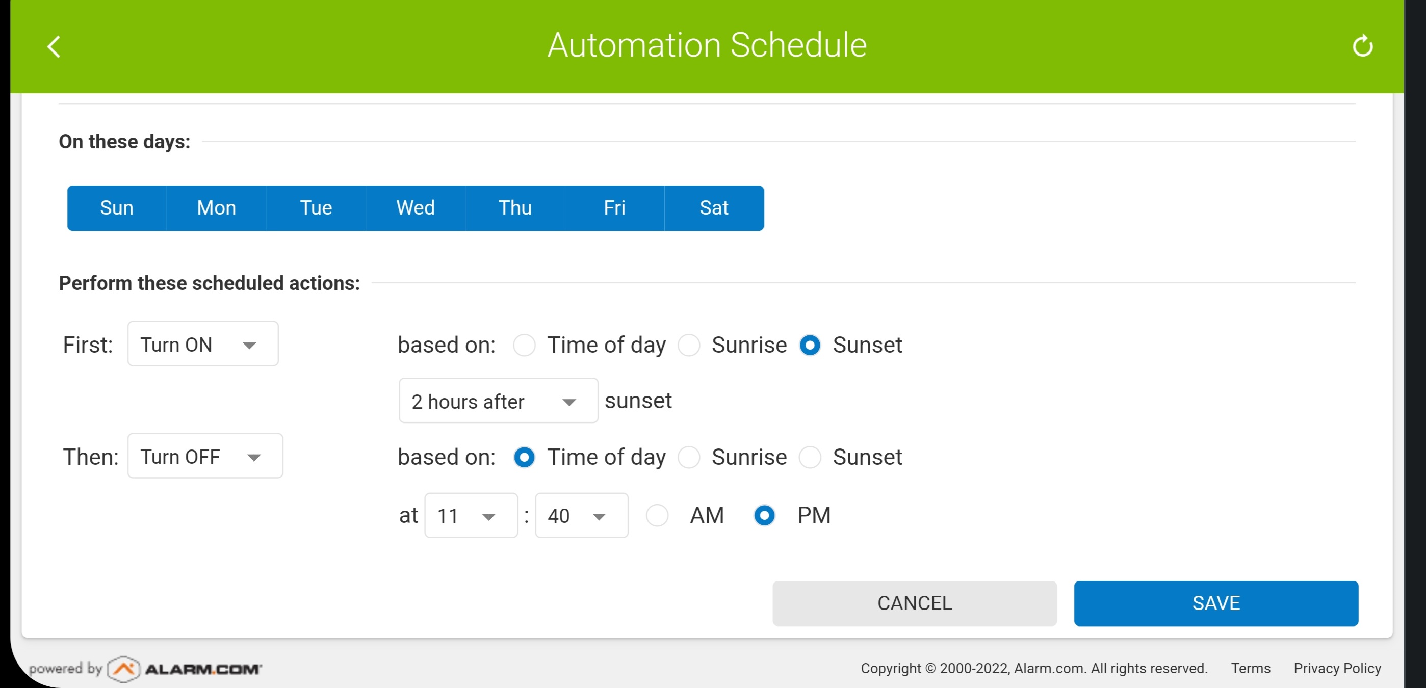 I was able to schedule by logging into the alarm.com website but I didnt see the ability to do it from the alarm.com android phone app…can I do the same scheduling of a light from phone app?